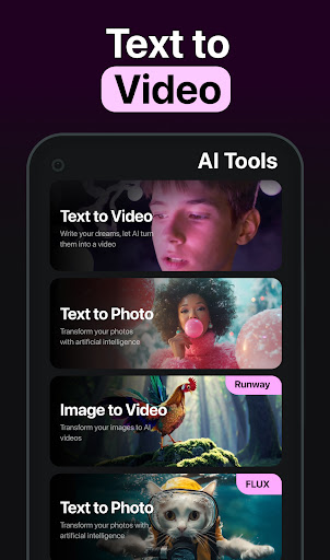 Here’s what you do: you just type out your idea or prompt, and the AI will magically turn it into a video for you. And there’s also an AI photo generator – you can transform your text into images too. And you can even take your photos and turn them into videos using the AI – it’s super simple, just upload a pic and let the app work its magic.