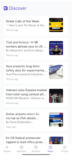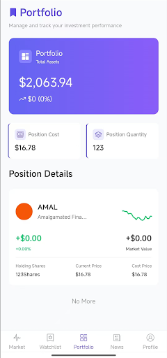 Here’s what you can do: You can search for any stock and add it to your watchlist. And there’s also a dashboard that shows you the status of your portfolio – your positions, average cost, market value, and gains/losses. And the live news feed is useful for staying on top of market events and earnings reports.