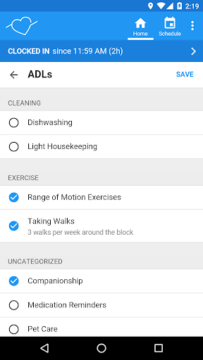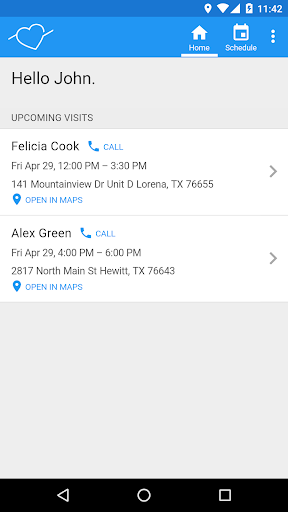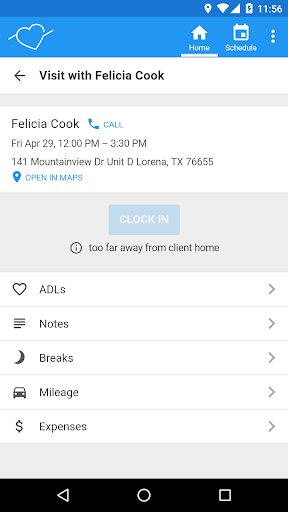 Here’s what you can do: you can clock in and out for visits, which is restricted by GPS so your agency knows you’re actually at the client’s place. There’s also features to document the activities you do, record care notes, track mileage and expenses, and even navigate to the client’s home. It’s got a nice calendar view to see all your upcoming and past visits.