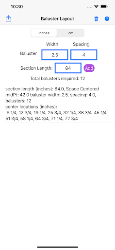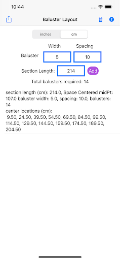 The app lets you enter the railing length, baluster width, and the spacing you want. Then it calculates the optimal number of balusters and where to place them to meet building codes. There’s also an option to handle multiple railing sections, which is pretty handy for more complex projects. And you can switch between inches and centimeters – that’s useful if you’re working with both imperial and metric measurements.