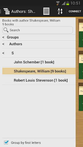 Application works very well for me! I would like to see the listing of books by title on a large server (as displayed on your phone ) available by initial...