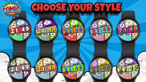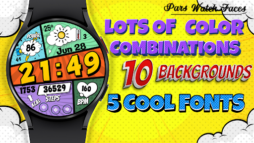 Here’s what you can do: There’s 10 different background styles and a bunch of vibrant color options. And it’s got 5 cool pop art fonts too, so you can make the time display look really sweet and comic-y. And you can easily switch between the styles right from the watch settings – took me a while to figure that out but it’s pretty useful.