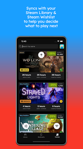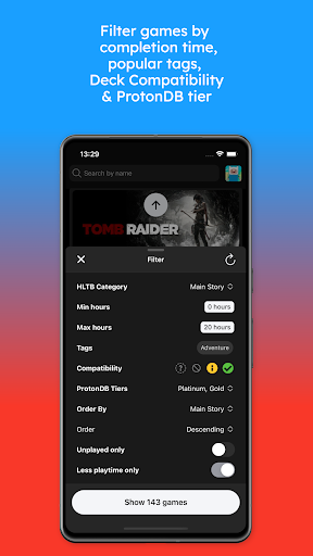 Here’s what you can do: You can sync your whole Steam library and wishlist, then filter through everything by playtime, game ratings, Deck compatibility, and more. And there’s also a neat feature that shows you the estimated time to beat each game – super useful for picking what to play next. And the sorting options are really flexible, you can organize your games in all kinds of ways.
