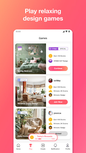Here’s what you do: you can basically visualize furniture and decorations in your own floor plans. There’s also games where you compete against others on interior design challenges. And you can earn rewards and build up a portfolio of your designs – took me a while to figure that part out but it’s actually pretty cool.