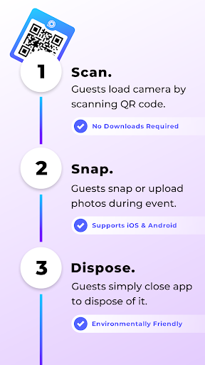 Here’s how it works: you scan a QR code to load the camera, then your guests can take photos that automatically get added to your private event album. There’s also an option to make the album shareable if you want. And the best part is, guests don’t even need to download an app – they just use the camera in the browser.