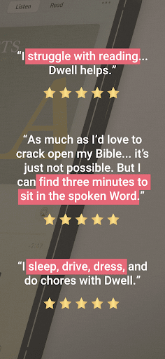 Been using Dwell: Audio Bible for a couple months now. It’s basically an app that lets you listen to the Bible in all sorts of different versions and narrators. Pretty solid if you’re into that kinda thing.
