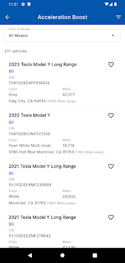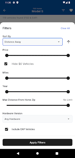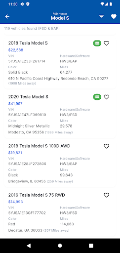 Here’s what you do: the app scans the listings and finds the 1-2% of Teslas that actually have FSD included. There’s also a Favorites page where you can save the ones you’re interested in. And you can filter by location, price, and other specs – took me a while to figure that out but it’s useful.