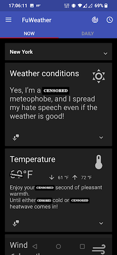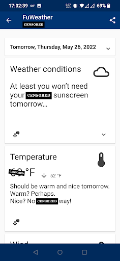 I’ve been using FuWeather for a couple months now. It’s basically a weather app, but with a twist – it’ll actually complain and swear about the weather forecast. Pretty funny stuff.