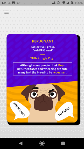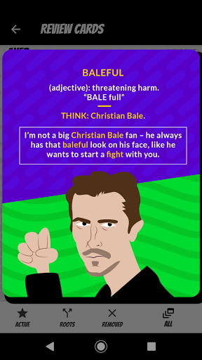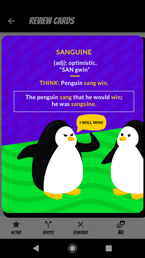 Here’s what you do: You go through flashcards of over 1300 GRE words, each with a cartoon illustration, a clear definition, and a memorable mnemonic. And there’s also a section for 160 word roots which is pretty cool. And the app tracks your progress so you can see which words you’ve mastered.