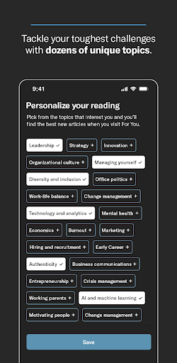 Here’s what you do – there’s a personalized feed that uses AI to curate articles just for you. You can also browse through different topics like leadership, management, and technology. And it’s got a really clean and easy to navigate interface. Took me a while to figure out some of the features but they’re pretty useful once you get the hang of it.