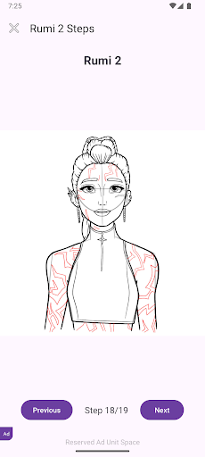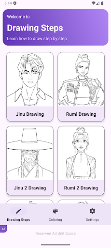 Here’s what you do: there’s a big library of characters you can choose from, like Kpop idols, demon hunters, and all sorts of funny and cute anime-style art. You just pick one, follow the step-by-step drawing guide, and then you can color it in with one-tap fills or use the brush tools to get creative. There’s also an undo/redo function which is super handy when you mess up.