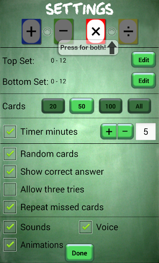 Here’s what you do: there are flash cards with math problems, and you have to solve them. There’s also a countdown timer, which adds a little test-like pressure. You can adjust the number ranges too, like 0 to 50 for addition and subtraction, or 0 to 20 for multiplication and division. And you can even pick two operations at once, which is a nice way to mix it up.