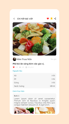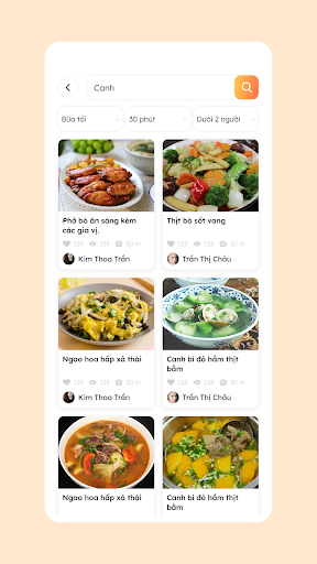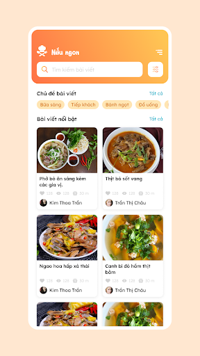 Here’s what you can do – you can browse through all the featured recipes, which have big photos of the food, the recipe name, how many people like it, how many views it has, and when it was posted. And there’s also a list of the ingredients needed for each dish with the exact amounts. And you can see who the author is, like Kim Thoa Tran or Tran Thi Chau, along with how many people have liked their recipe.
