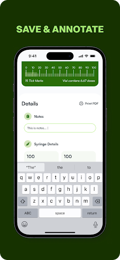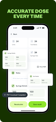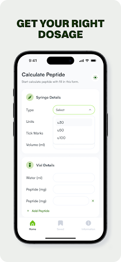 Here’s what you can do – there’s all these options for syringe sizes like U20, U30, U100 and so on. You can use the app to calculate the measurements for reconstituting your peptides. And it’s got a cool chart that tells you how much water to add. And you can save your calculations and add notes, which is really useful for keeping everything organized.