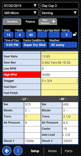 Here’s what you do: you can download pre-made setup sheets, then store your own notes and settings for different races. There’s also a gear calculator that’s super useful for testing RPM changes. And the inventory tracking is handy for keeping tabs on your parts and tires.