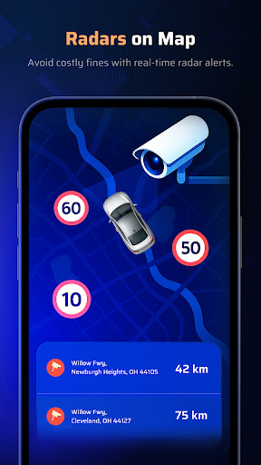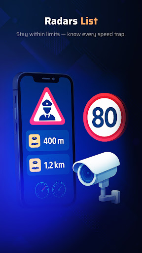 Here’s what you do: You can see all the speed traps and cameras on a map, plus it gives you voice alerts when you’re approaching them. And there’s also a HUD (heads-up display) feature that projects your speed and the speed limit right onto your windshield, so you can keep your eyes on the road. And the radar list shows you all the nearby enforcement points with direction and distance – handy for planning your trip.