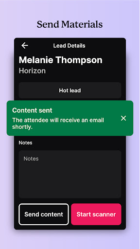 Here’s what you do – you can scan attendees’ badges or business cards, edit their info, add custom questions and notes. There’s also a feature to send them content right from the app, which is pretty cool. And you can sync the leads to your CRM system – took me a while to figure that out but it’s useful.