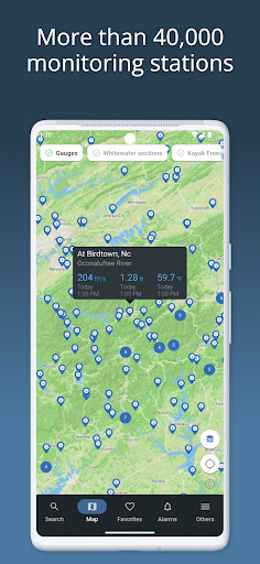 Here’s what you can do – there’s a map with over 40,000 hydrometric stations, so you can see the current water levels and temperatures for rivers near you. You can also check out detailed info on whitewater sections, which is pretty cool. And the app has data from 15,000+ rivers, not just in the US but across 20 countries.
