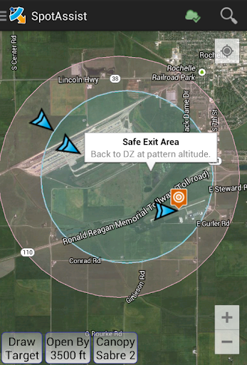 Here’s what you can do: you can check the satellite map to see dropzones worldwide, along with the current windsaloft and surface winds. There’s also a feature that displays your parachute’s range and a safe jump area (that’s an in-app buy though). And if you zoom in, it’ll even show you the recommended pattern for your canopy – super handy.