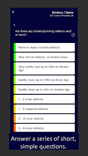 Here’s what you do: you answer a series of short questions about the condition of your comic, and the app will give you a grade. And there’s also a feature that tells you if your book would get a Qualified or Restored label. Took me a while to figure that one out but it’s actually pretty useful.