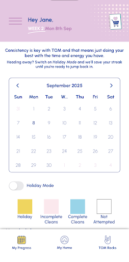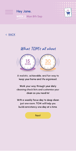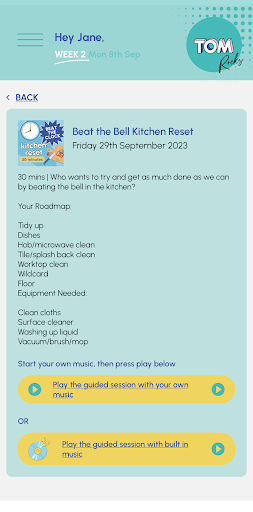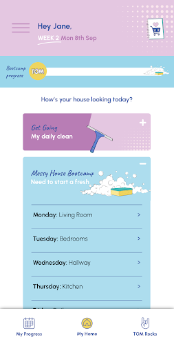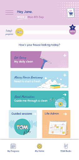 Here’s what you do: there’s a set of daily tasks to keep things ticking over, and an 8-week cleaning plan to help you clean smarter. And it’s got these guided sessions too – TOM Rocks – which keep you company while you’re cleaning, cooking, or getting life sorted. And you can customize your own routines and tasks, which is super useful.