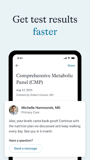 Here’s what you can do: You can text chat with your doctors and nurses 24/7 to get help with symptoms, meds, or anything else. There’s also a feature to book video visits or in-person appointments. And you can quickly check your test results – sometimes even on the same day you get them.