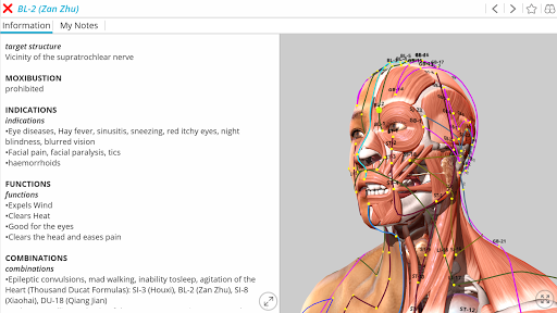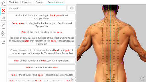 Here’s what you can do – there’s a full interactive 3D anatomy model with muscles, bones, and organs. You can hide, fade, or highlight different parts. And the app’s got a ton of info on acupuncture points and meridians – you can search by name, function, or indication. Real helpful for learning.