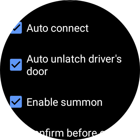 Here’s what you can do: You can automatically unlock and lock your Tesla as you walk towards and away from it. There’s also a feature that’ll unlatch the driver’s door when you approach. And you can open the frunk, trunk, and charge port with just a tap. It’s got a handy little tile on your watch face for quick access to all the commands.