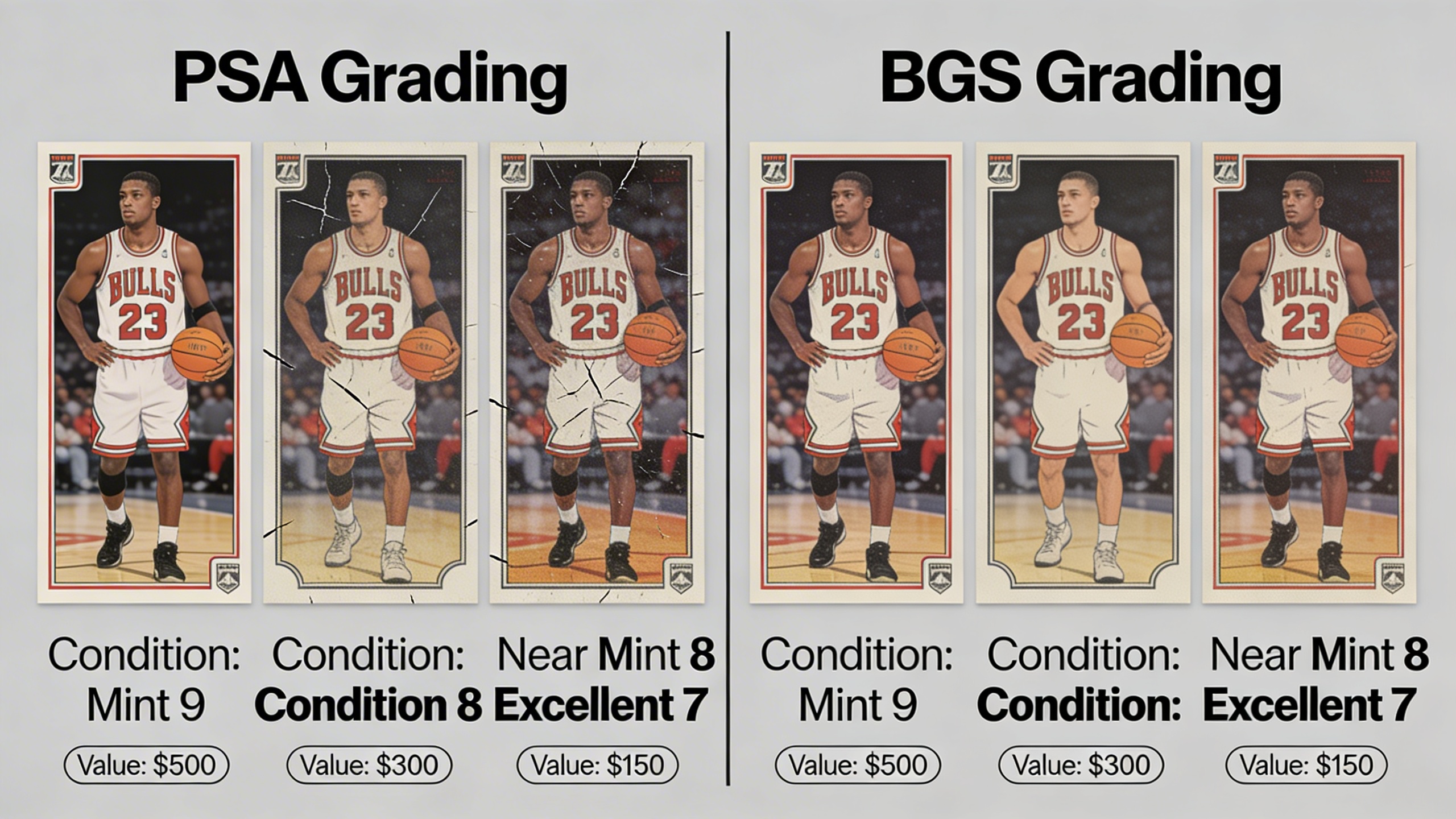 Grading standards focus on four primary factors: centering, corners, edges, and surface quality. Even minor imperfections can dramatically impact value—a PSA 9 Michael Jordan rookie might sell for $150,000 while a PSA 8 of the same card brings $75,000, demonstrating how single grade differences create substantial value gaps.