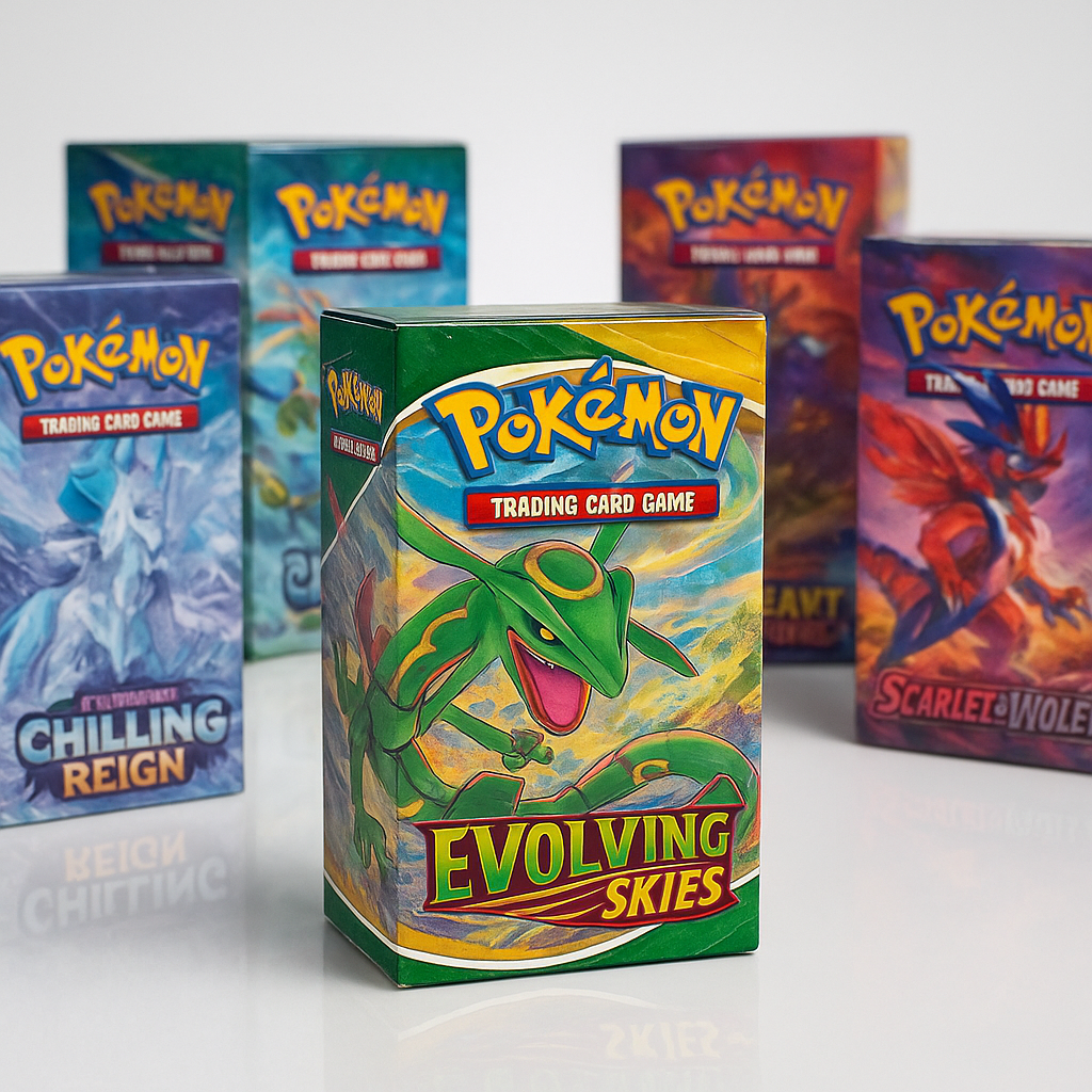 The evolving skies booster box remains the gold standard for modern Pokemon collecting, commanding $180-220 in the current market. This premium pricing reflects the set’s unparalleled chase card selection, including Rayquaza VMAX Alternate Art (currently $400-500), Umbreon VMAX Alternate Art ($300-400), and Sylveon VMAX Alternate Art ($200-300). With alternate art pull rates of approximately 1 in 24 packs, Evolving Skies offers the perfect balance of accessibility and excitement.