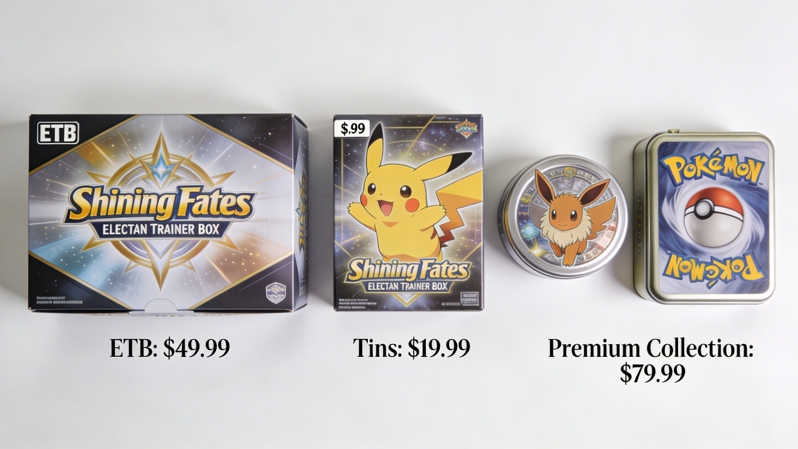 Mini tins provided the most budget-conscious option at $12.99 retail, containing 2 booster packs each. These compact products featured the same three Pokemon artwork variants and became popular for gift-giving and impulse purchases. Despite containing fewer packs, the shining fates tin products maintained the set’s generous shiny pull rates.